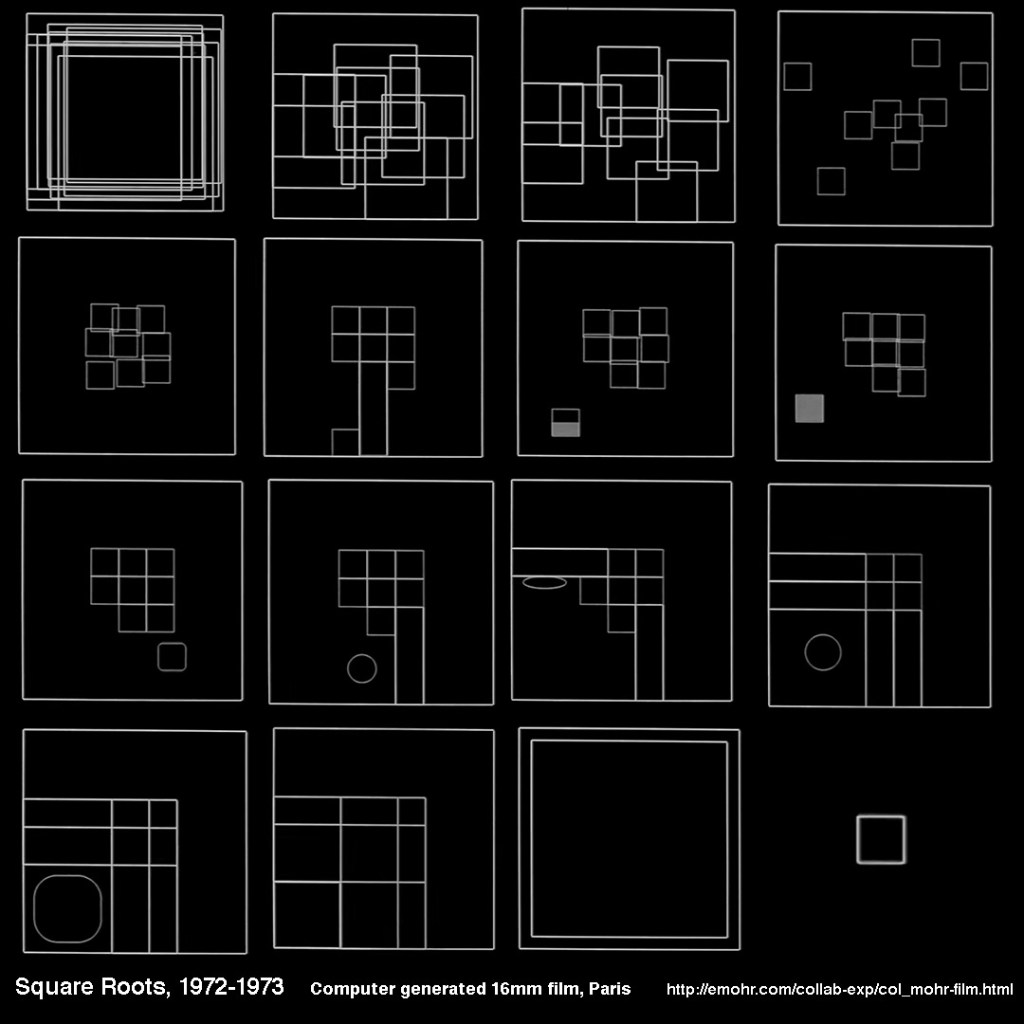 In my investigation into experimental film I felt that I had narrowed my scope by looking at artists from around the same time period of the early 20th century. To combat this I wanted to look for something technologically daring from later in the development of film as a creative medium. This is when I discovered Manfred Mohr, one of the very first film makers that experimented with computer generated film. One of his earliest films, Square Roots, stood out to me in particular as it presents the technological cutting edge he was working with while still being early in his personal development as an artist. Mohr states that he created this film by programming it into a FORTRAN IV and run on a CDC 6400 computer before using a DATAGRAPHIX 4460 microfilm camera to render the data onto a roll of 16mm film. Mohr himself was not happy with the film as he felt it was too narrative in structure and began producing more abstract works in response, I however felt that the film was dazzling. I am uncertain of my ability to achieve something as technically daring as this must have been at the time, but I may have to consider using new technology in the future when I am more comfortable with experimental filmmaking.